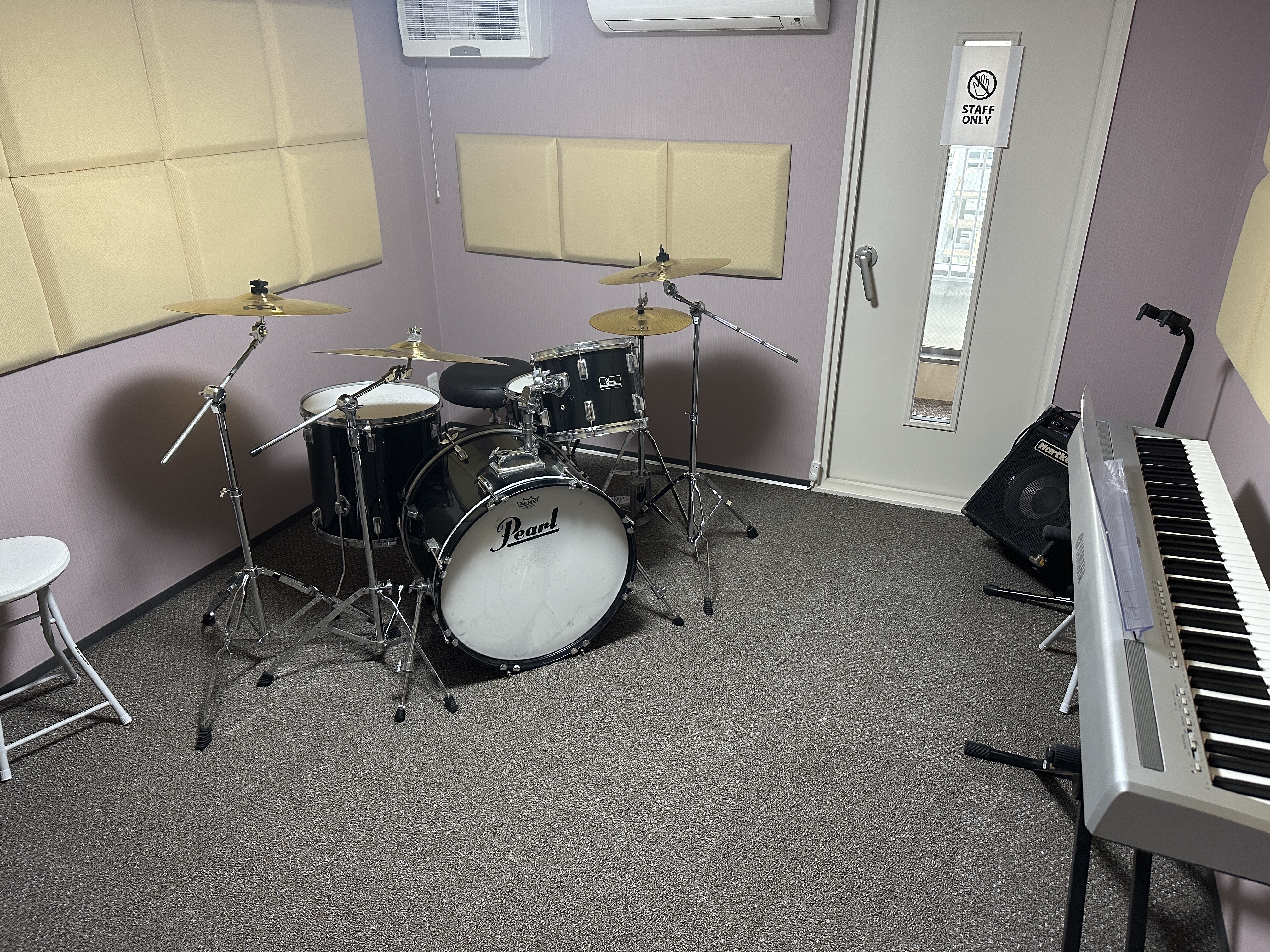ギター・ベース等のアンプ、ドラムセット、ボーカルなどの各種PAを取り揃えたバンドルーム。7畳のスペースでレッスン他、バンド練習などにも快適にご利用いただけます。